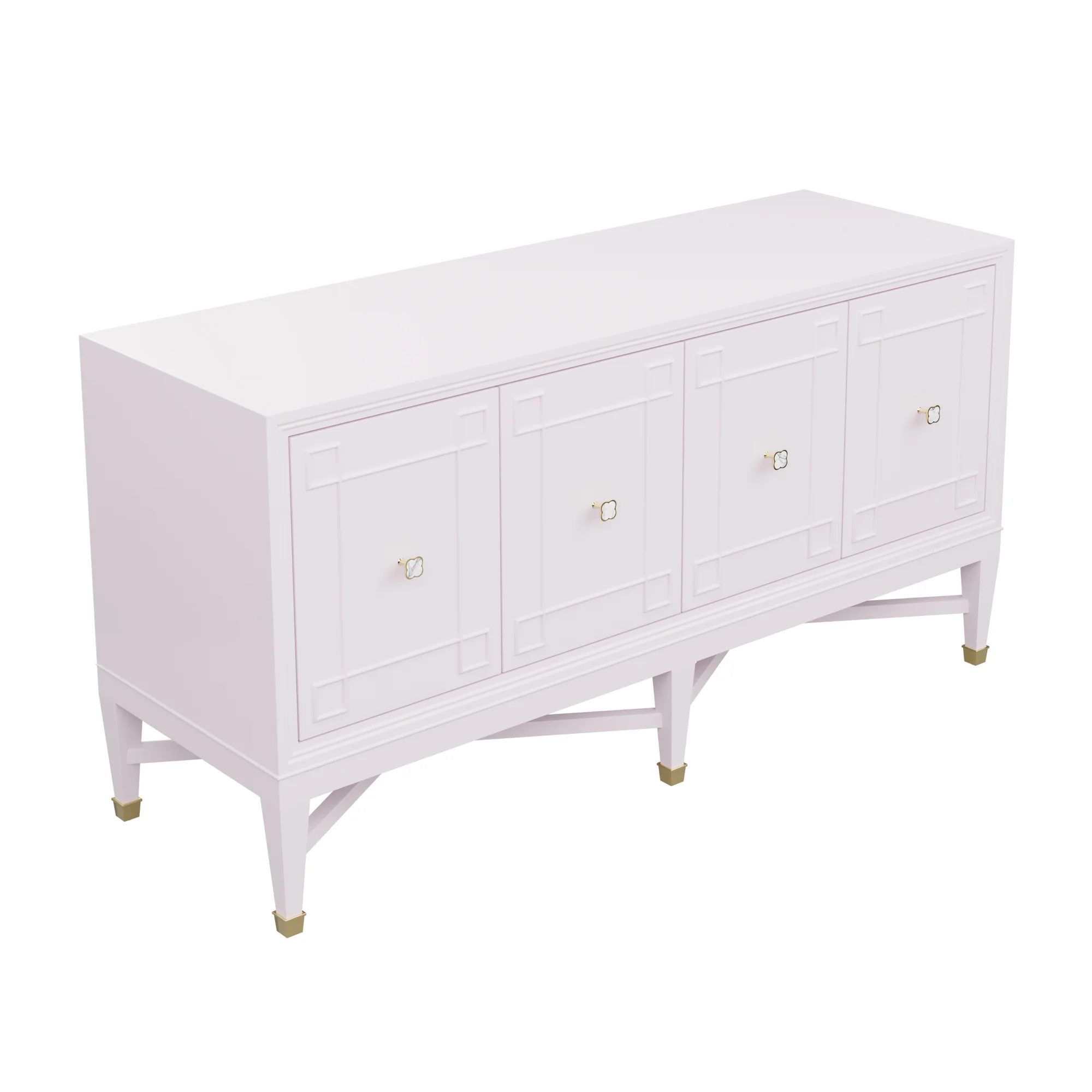 Our bespoke Ariel Credenza features four roomy cabinets with unique carved detailing. Perched atop a double x base and brass sabots, clover hardware adds a lucky touch to this contemporary case good.