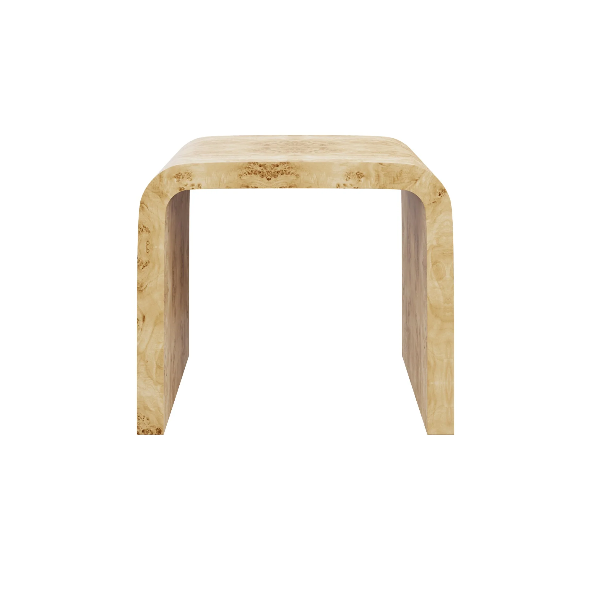 Our Janus Side Table features a simple design that curves into a waterfall edge. Its clean shape lends itself to styling versatility with a timeless burl wood finish.