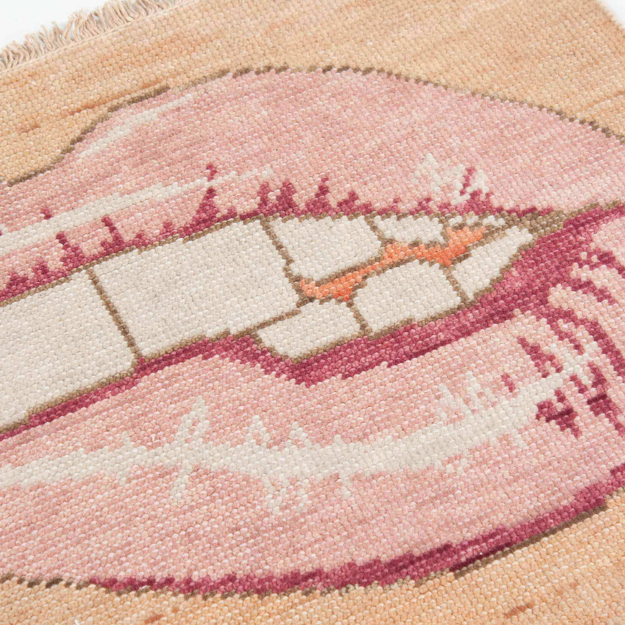This wool rug was designed by Scout and hand woven with a Turkish-style knot by artisans in India. It features a durable wool construction and light salmon pink background with a pink lip design.