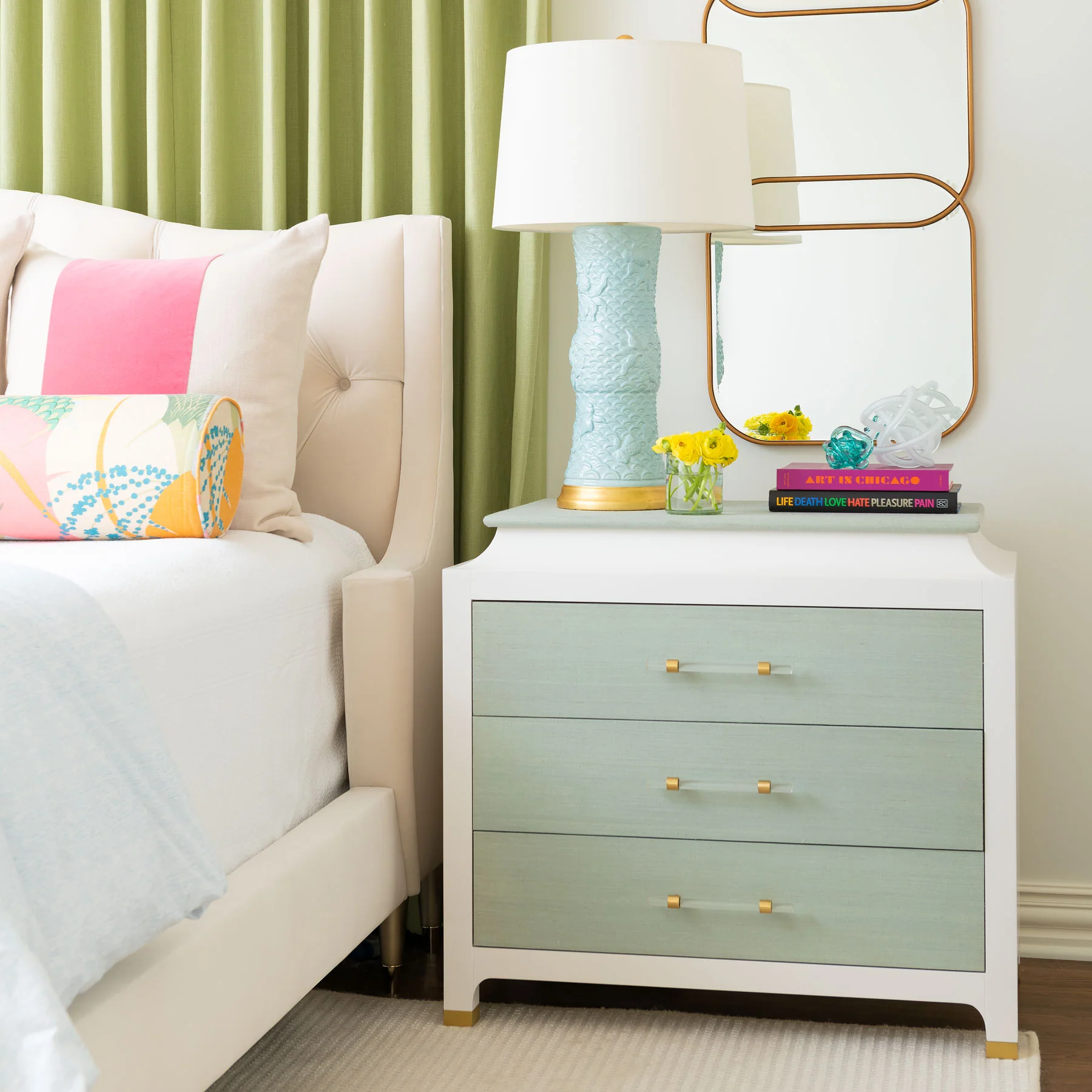 The Recon features a white lacquer finish with the drawers and top in our Caroline Grasscloth. Finished with acrylic and brushed brass handles with brass sabots for a glamorous look.